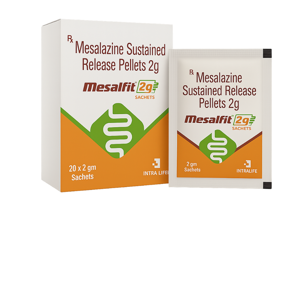 Mesalazine 2gm (PR Granules) is a potent anti-inflammatory medication primarily used for the treatment and maintenance of remission in ulcerative colitis and other inflammatory bowel diseases (IBD). Delivered in prolonged-release granules, it ensures targeted release of the active drug in the colon, minimizing systemic absorption and maximizing local therapeutic effect. Mesalazine acts by inhibiting the production of pro-inflammatory mediators in the intestinal lining, reducing inflammation, and alleviating symptoms such as abdominal pain, diarrhea, and rectal bleeding.