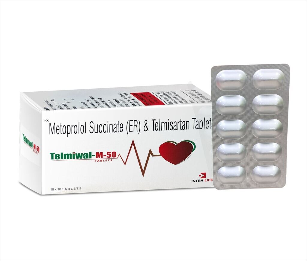 This combination tablet contains Telmisartan 40 mg, an angiotensin II receptor blocker (ARB), and Metoprolol Tartrate 50 mg extended-release, a selective beta-1 blocker. Together, they work synergistically to manage hypertension by relaxing blood vessels, reducing heart rate, and improving blood flow. This combination is ideal for patients requiring dual-action therapy to maintain optimal blood pressure levels and reduce the risk of cardiovascular complications such as stroke, heart attack, and heart failure. The extended-release formulation ensures stable blood pressure control throughout the day with once-daily dosing convenience.
