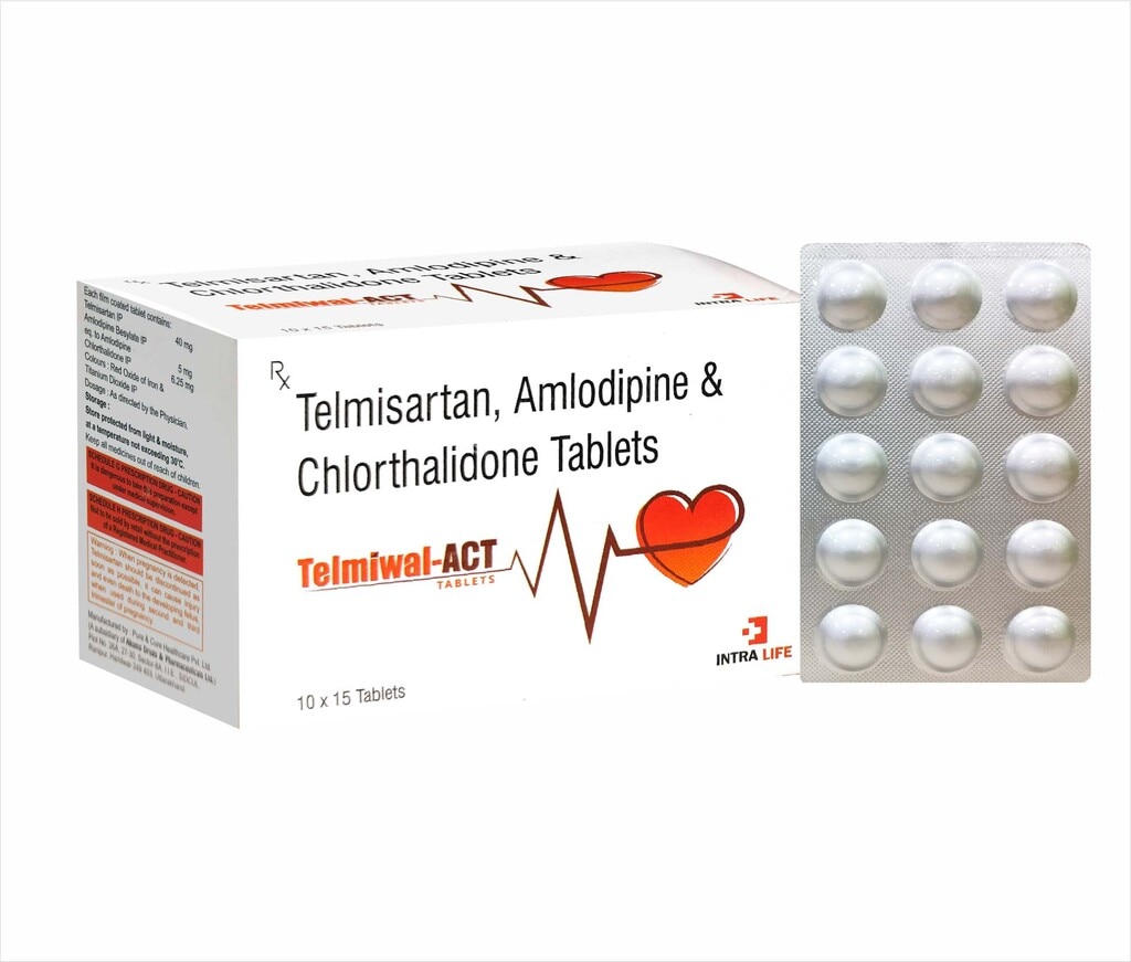 This combination tablet is formulated for effective management of hypertension. Telmisartan is an angiotensin II receptor antagonist that relaxes blood vessels and lowers blood pressure. Amlodipine, a calcium channel blocker, helps dilate blood vessels and improves blood flow. Chlorthalidone is a thiazide-like diuretic that reduces excess fluid and sodium, further controlling blood pressure. Together, these three agents provide synergistic action, ensuring optimal blood pressure control while reducing the risk of cardiovascular complications. This medication is ideal for patients requiring multi-drug therapy for hypertension.